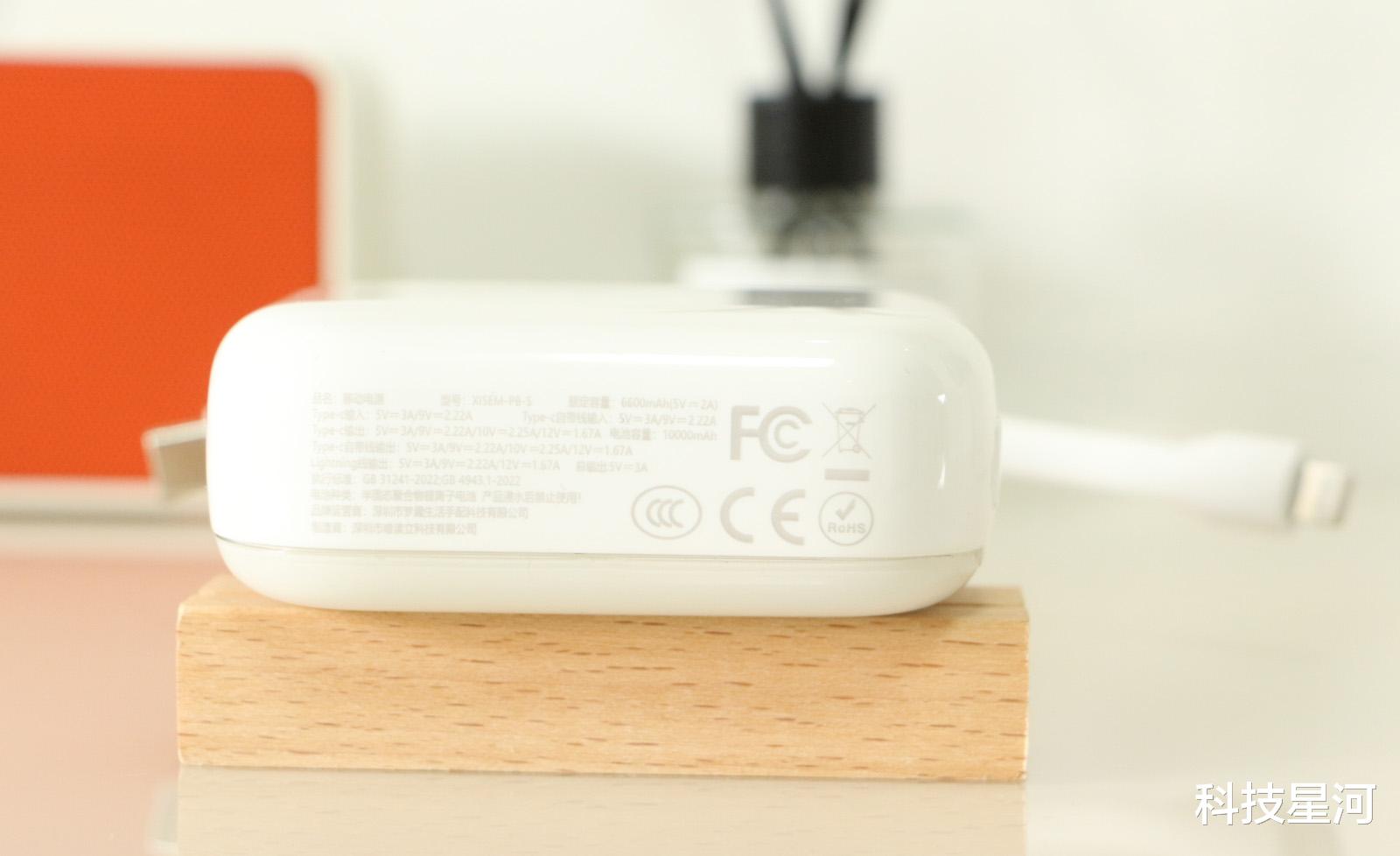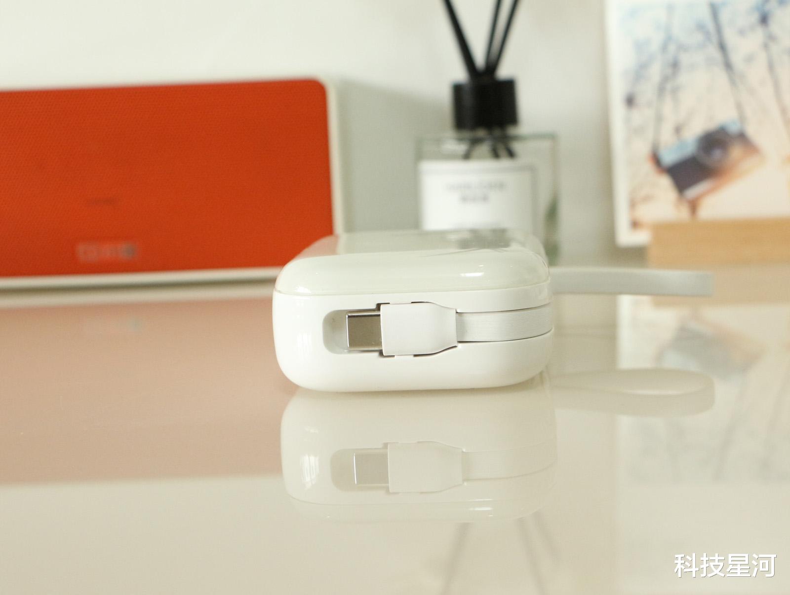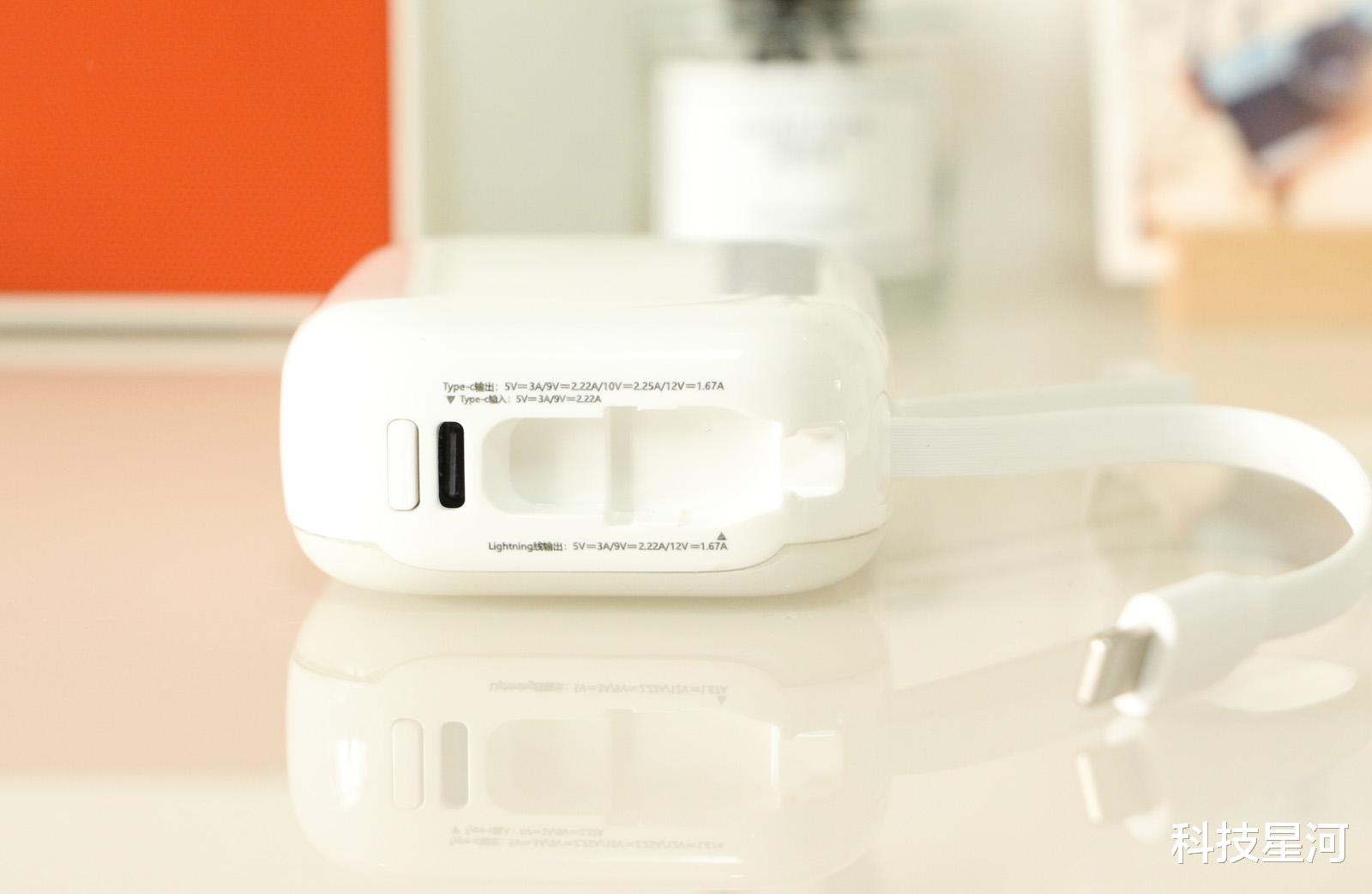 这移动电源随身自带Lightning+Type-C双快充线,无需额外带线,对于很多人来说,忘记带线的问题终于不复存在了。
