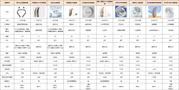 在做出最终决定之前,查看产品的基本数据是非常重要的。这不仅能帮助大家迅速了解各款助听器的性能差异,还能让你心里有个底。接下来,下面这张表格展示了参与本次测评的几款助听器的详细参数,帮助大家更好地进行对比。看了数据,你自然会知道自己最需要的是什么。