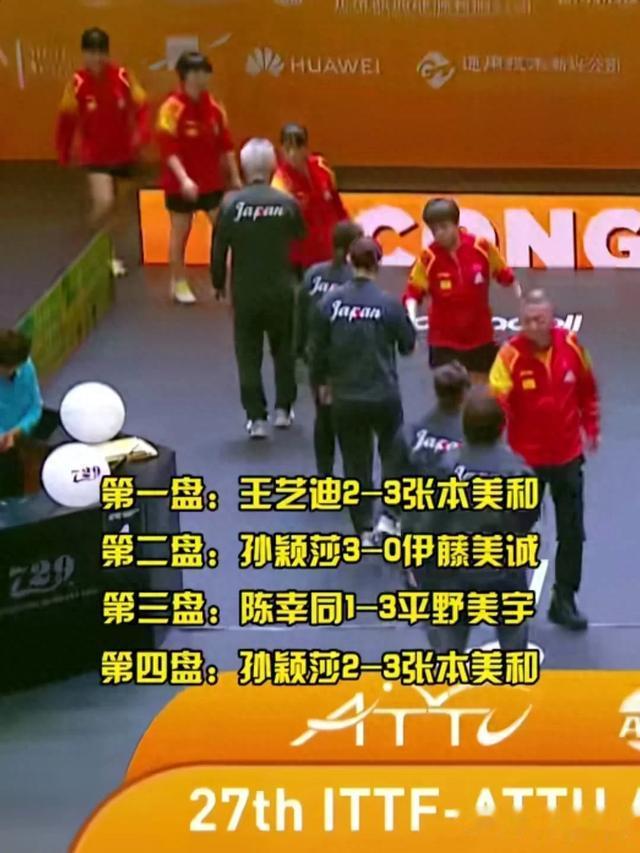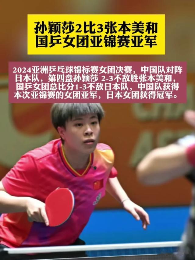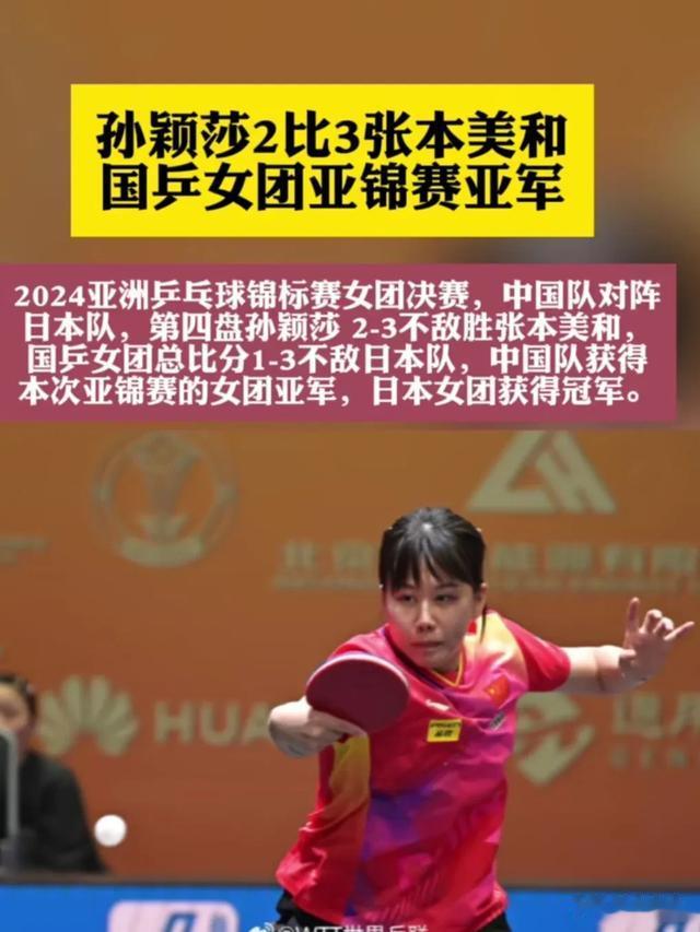 4. 第四盘比赛:孙颖莎再次上阵对阵张本美和。孙颖莎在先胜2局的情况下,连丢3局,以2:3(11-9、11-6、8-11、7-11、6-11)遭张本美和逆转。最终日本女团以3:1战胜中国女团,获得冠军。