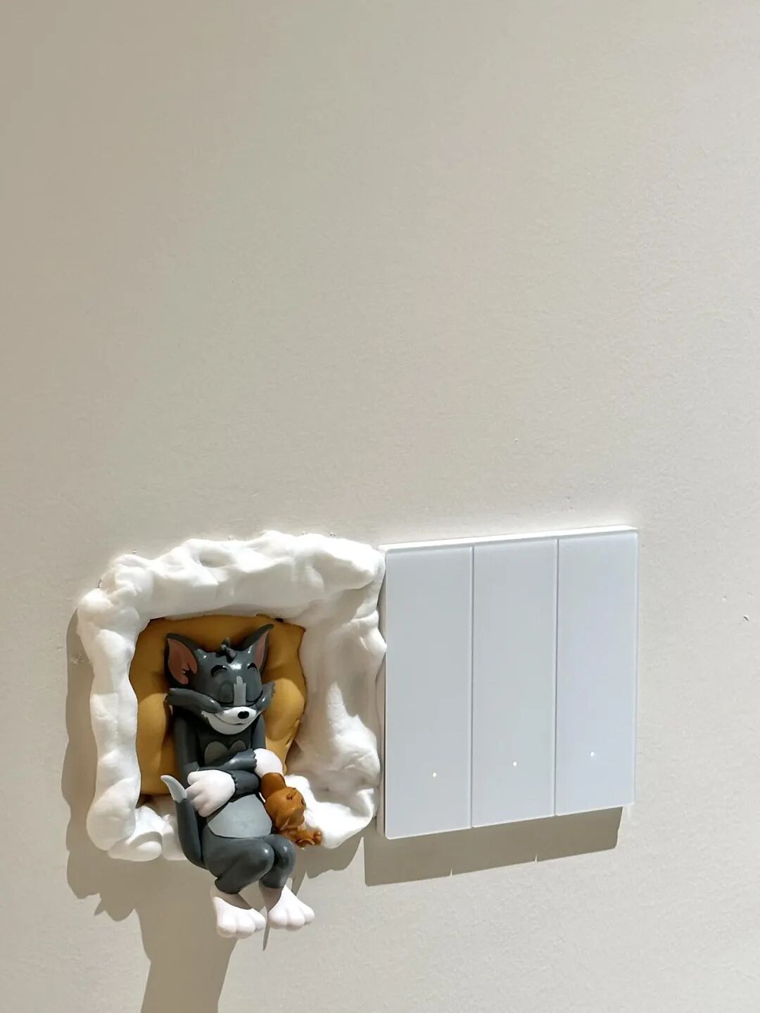 买一包白色粘土来装饰没用的开关孔洞,先用塑料或者保鲜膜垫一下电线,直接塞上粘土,捏成饼状塞进去就可以了,边缘修饰一下,再选一个喜欢的玩具,邻居来看都以为是刻意而为之。