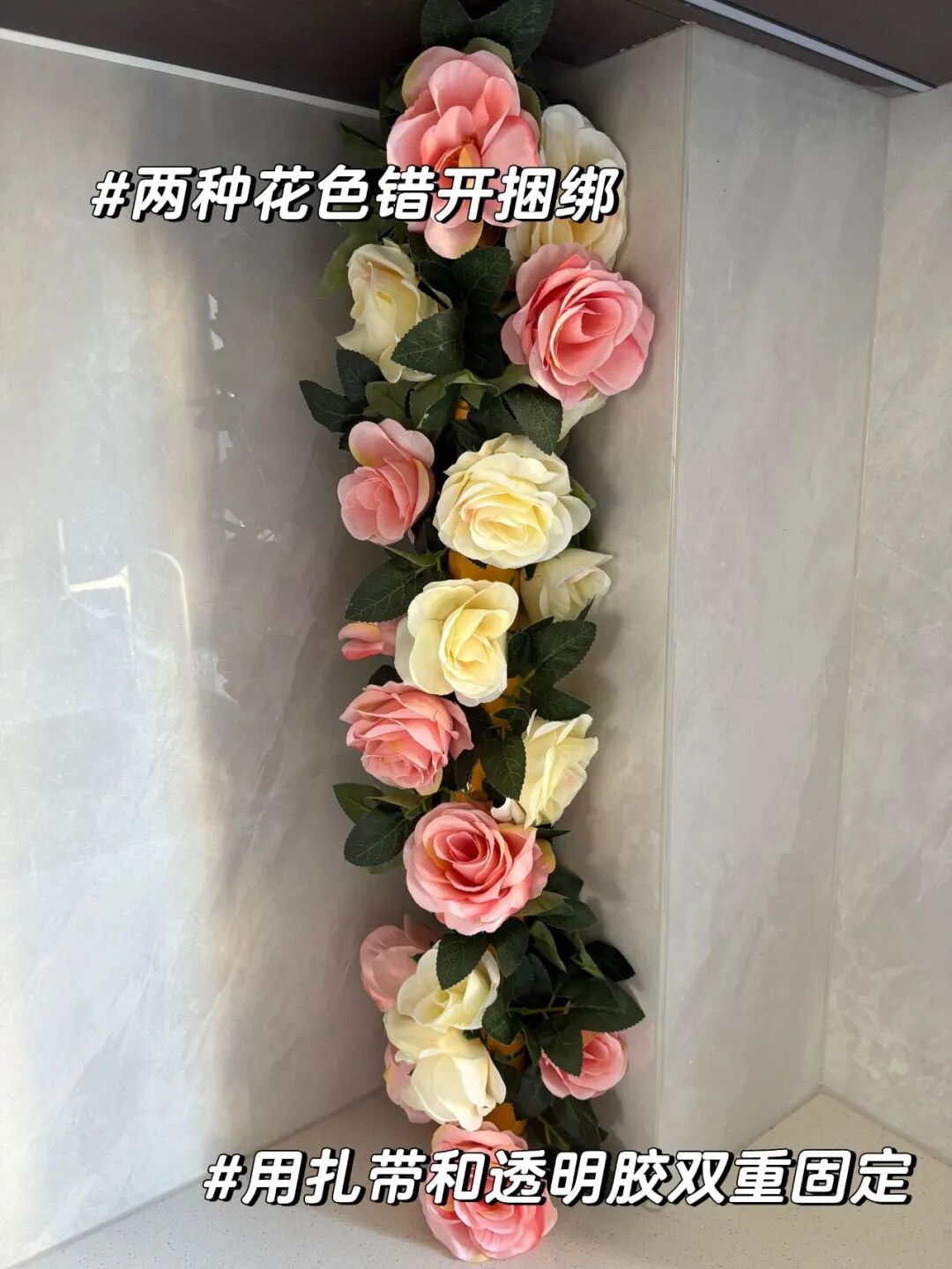 把长花苞剪成一小段,错落有致地绑在燃气管道上,用扎带或者透明胶固定。全部花苞固定好以后,手动整理一下花苞,让它开得更灿烂。