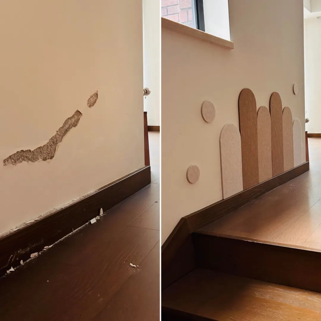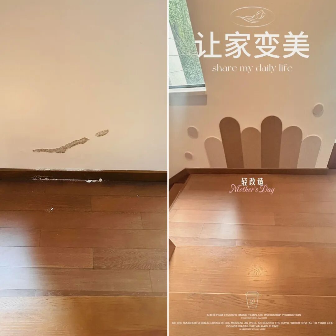 2019年装修的房子,墙面可能是渗水受潮,墙皮开始剥落,想着简单小修小补一下,于是花十多块钱买了棕色的毛毡来遮盖,不到半小时完工,效果可比原来的白墙好看多了,有活泼的感觉。