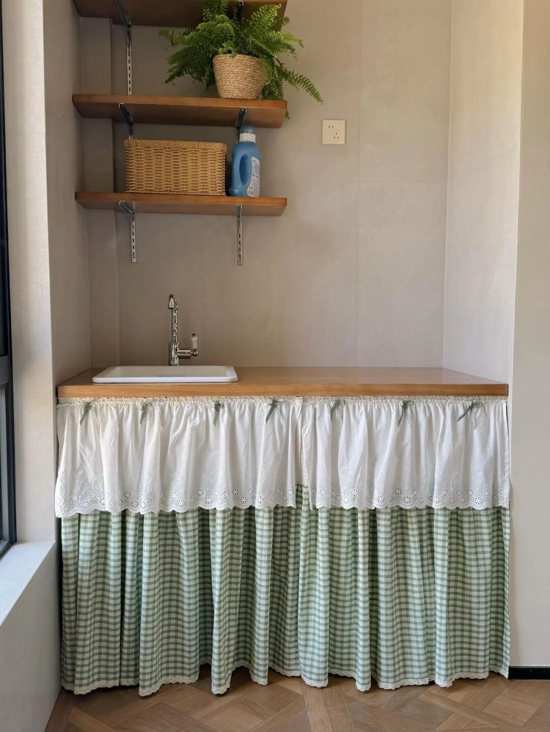 还有网友@壁画小姐布艺 家,厨房的杂乱橱柜,用伸缩杆挂上一个短纱帘,杂乱瞬间消失,取而代之的是浪漫又温馨的法式小角落,光线好的时候,纱帘上的光影更是美到心巴上!