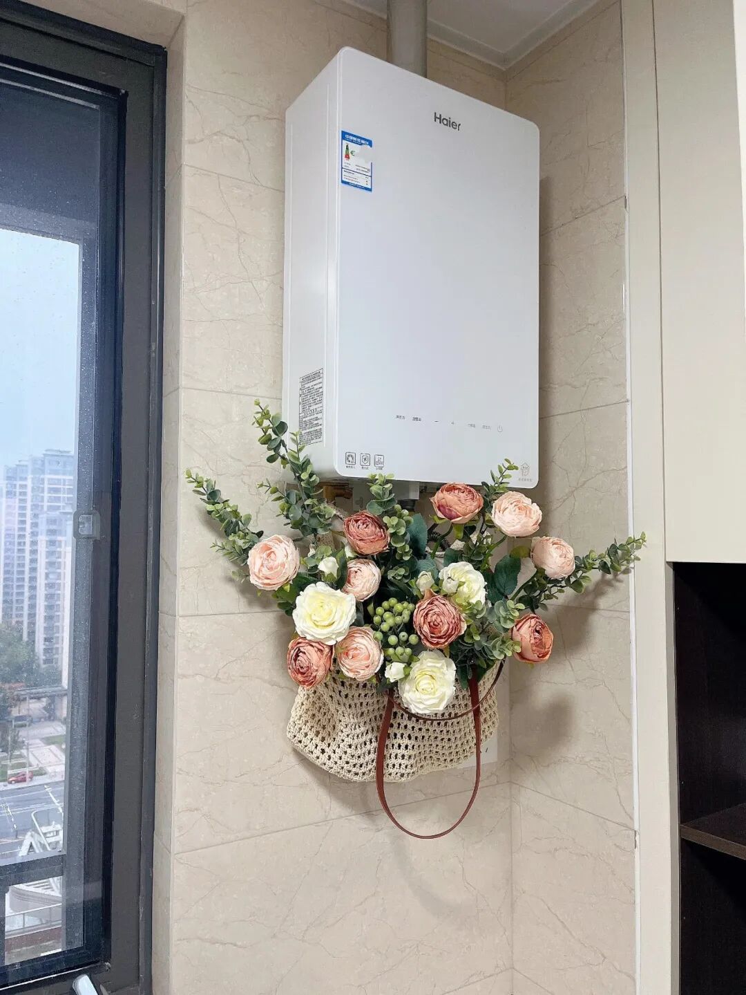 装修的时候,卫生间热水器的水管外露,看不顺眼好久了,借鉴网图,网上定制的亚克力板成品,和虞美人仿真花,改造后焕然一新。