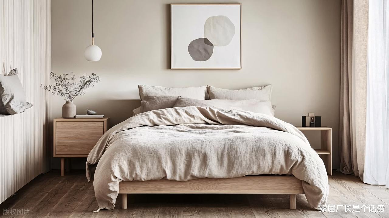 建议选莫兰迪色系、大地色系,比如浅卡其、米白色、浅灰色,这些颜色柔和不刺眼,给卧室加一层“柔光滤镜”,推开门就能感受到松弛感,晚上也能更快入睡。
