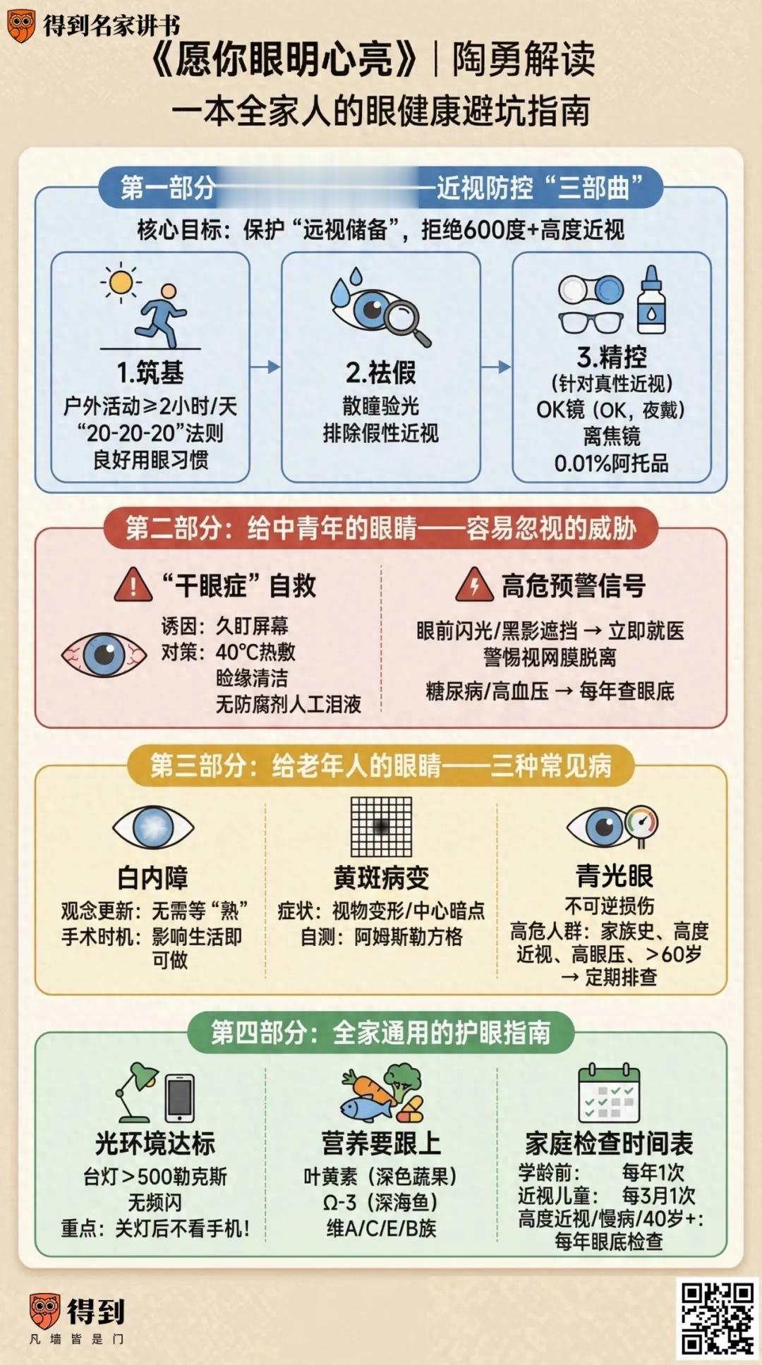 这本书,就是我想说的那些“你应该知道”的事。接下来,我从四个部分来介绍这本书:第一部分,给孩子的眼睛,近视防控哪些是真正管用的;第二部分,给中青年的眼睛,你可能正在忽视的那些威胁;第三部分,给老年人的眼睛,几种最常见的老年眼病,怎么发现,怎么处理;第四部分,全家人都用得上的护眼指南,饮食、光环境、产品选择,怎么做才是对的。