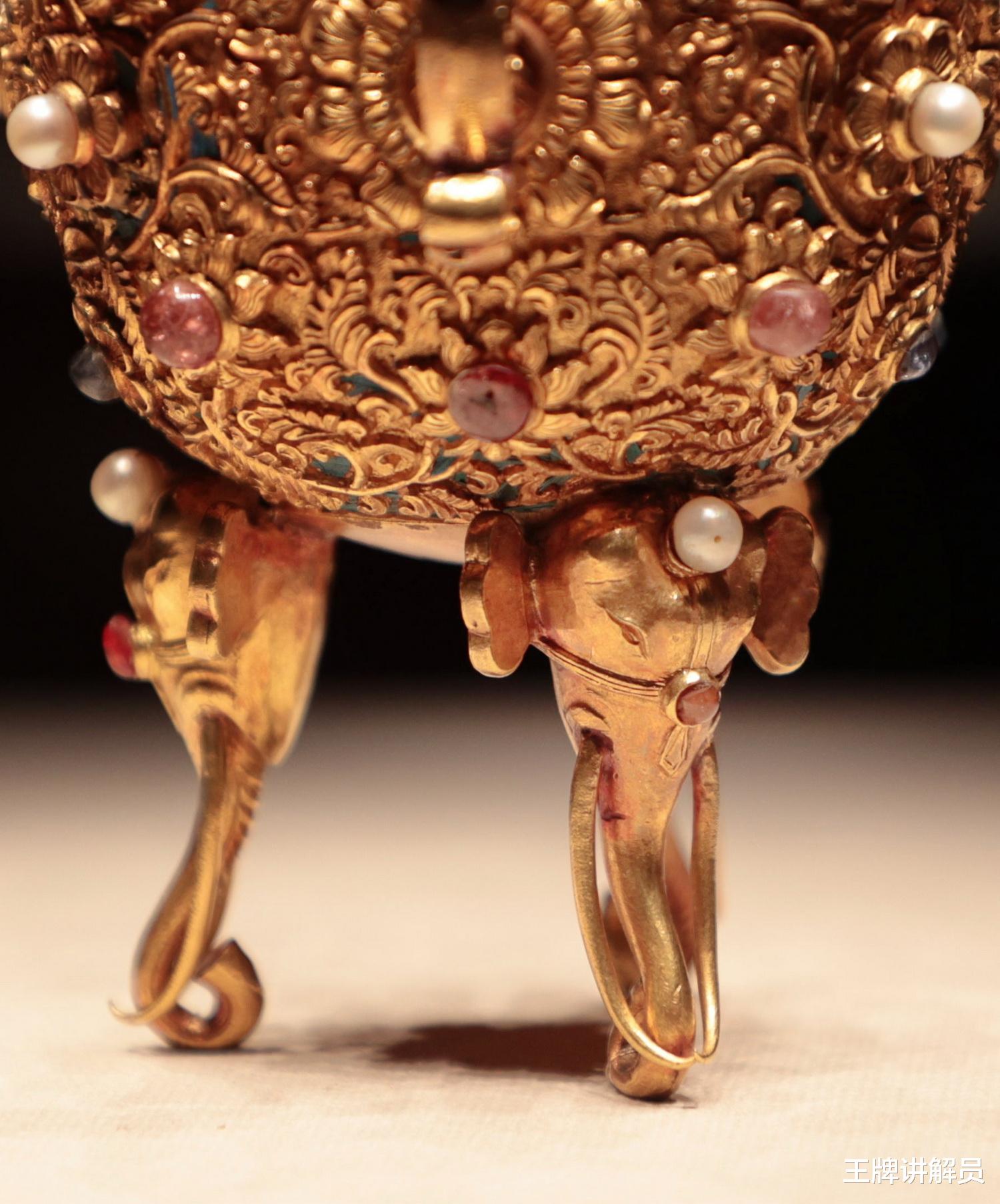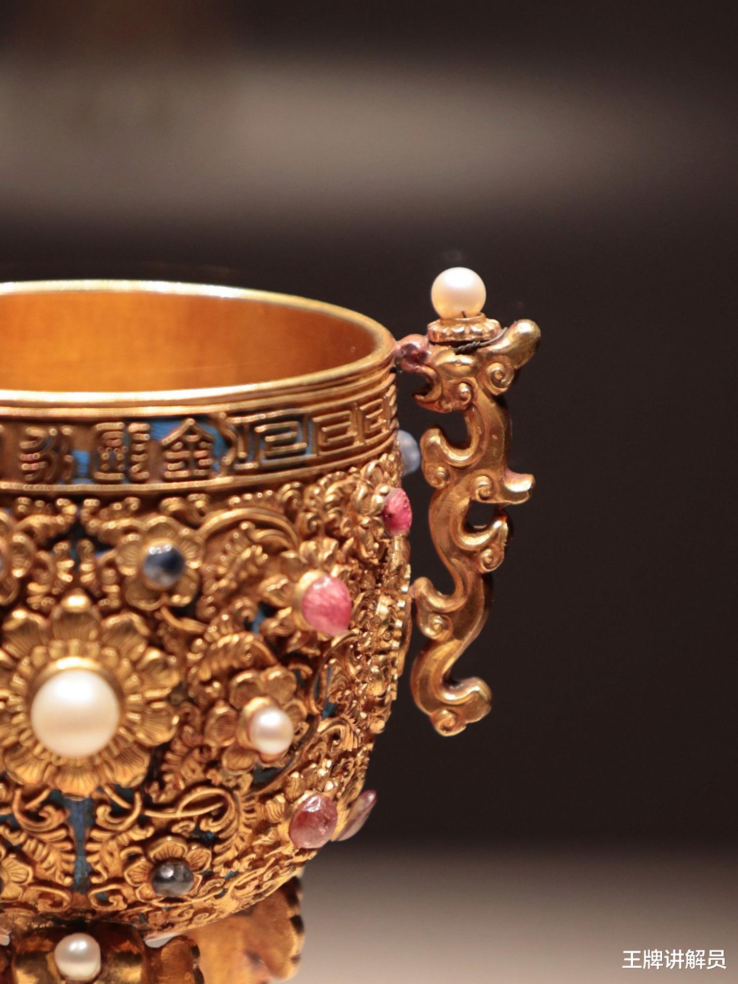 弘历首先把屠苏酒倒入一只金杯。屠苏酒属于药酒,有避除瘟疫的寓意。金杯则是专门为开笔仪式打造的,杯身缀满珍珠宝石,异常华美。