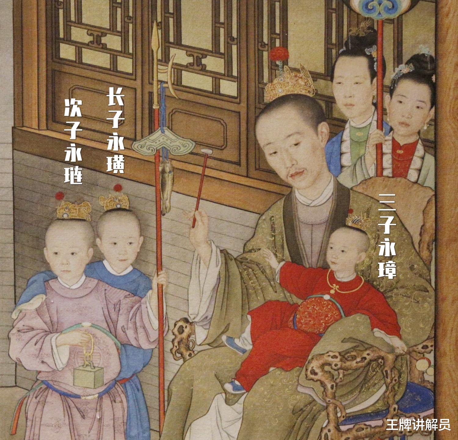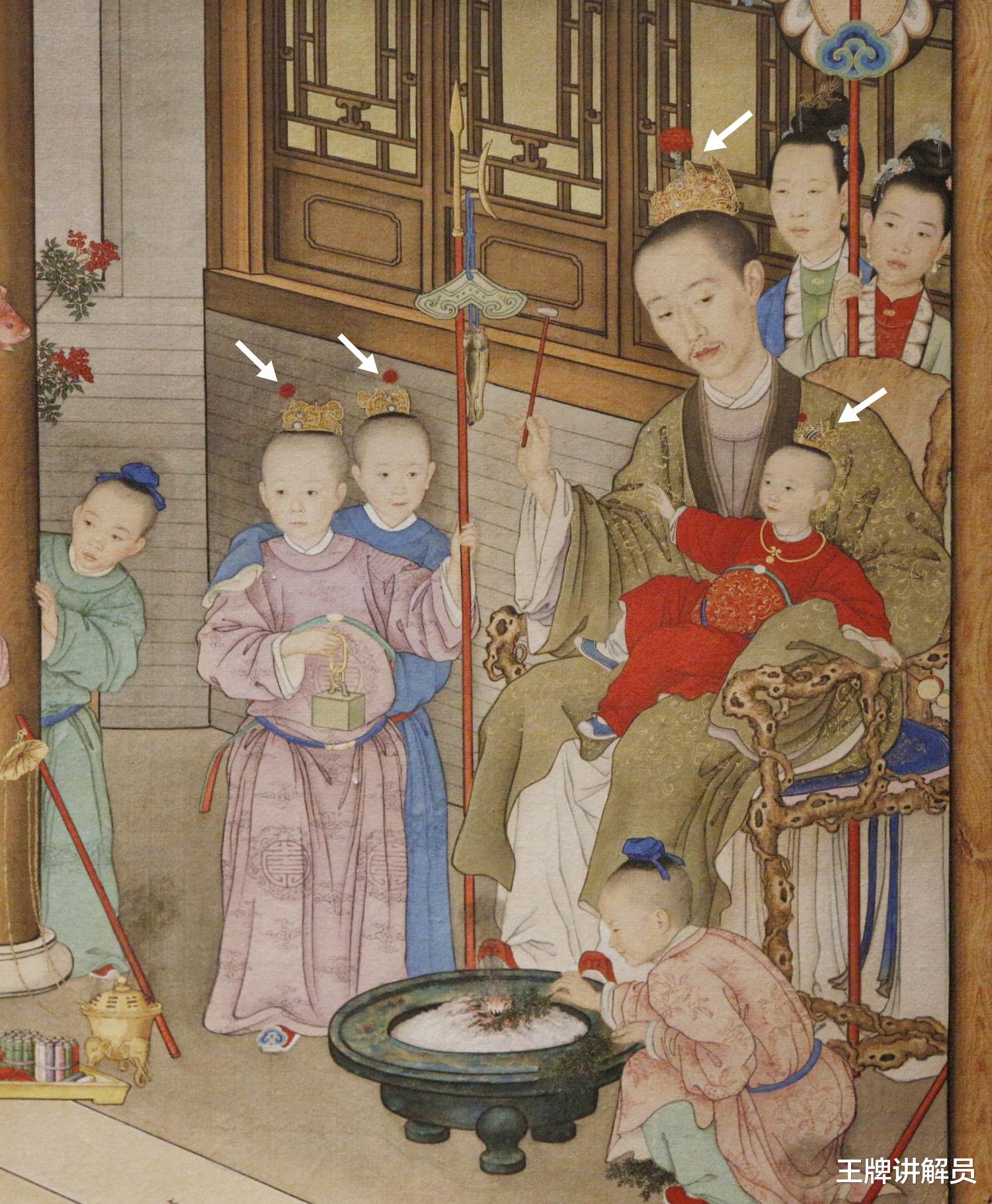 画中还有三位重要人物,三人虽然都是孩子,但与弘历一样头戴金冠。