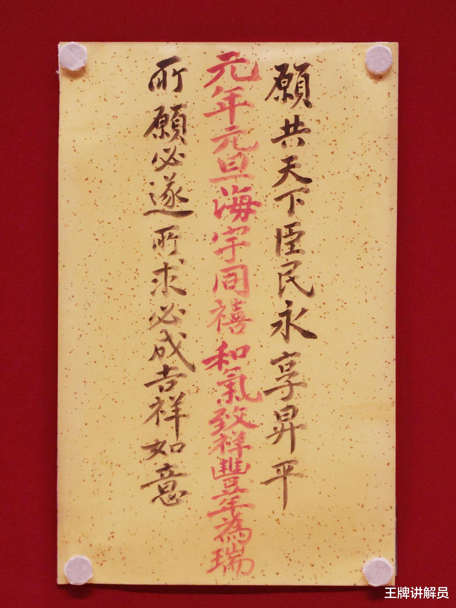 但皇上写的吉利话显然立意要高,格局要大,还要使用刻有“万年青”字样的毛笔,使用红黑两种颜色的墨水,写在撒了碎金箔的黄色笺纸上。
