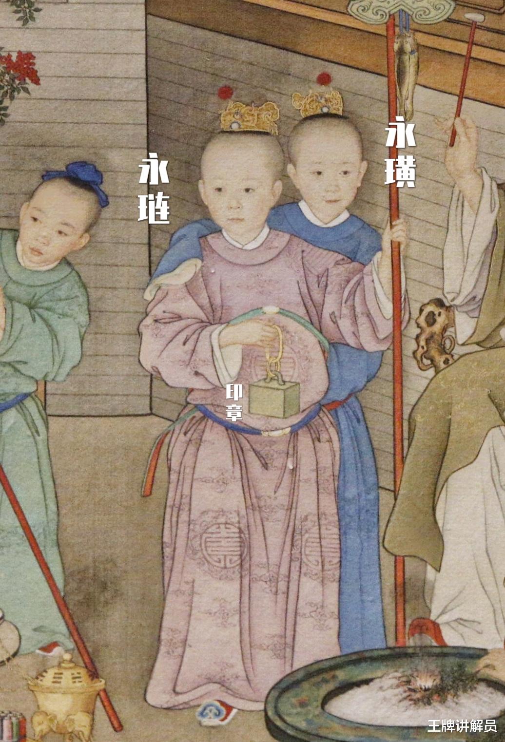画中的永琏站在永璜前方,手持印章,仿佛拿着天子的玉玺。