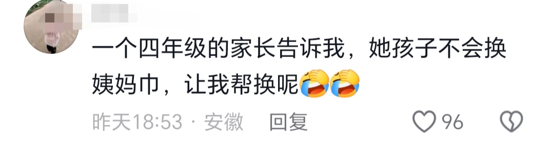 还有网友分享了类似经历:“之前见过四年级家长让老师帮孩子换卫生巾的,现在又来个让高中男老师备卫生巾的,家长们是不是把老师当成 24 小时待命的保姆了?” 大家普遍觉得,家长的这种态度,本质上是把自己的责任推给了老师,而且完全没考虑到男老师的处境 —— 主动递卫生巾不合适,不递又被指责,简直是两难。