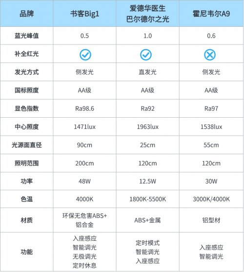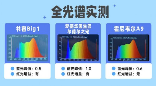 书客Big1蓝光峰值仅0.5,光谱曲线呈现显著红光增益,连续平滑贴合自然日光分布。这得益于SunArc三芯片全光谱灯珠与RRT3.0红光养眼技术,从芯片层面重构光谱,实现“科学控蓝+主动补红”闭环,真正从防护升级为养护。霍尼韦尔A9蓝光峰值控制在0.6,基础全光谱品质扎实,光谱连续性好,光生物安全性有保障,但缺乏红光增益,缓解疲劳的效果稍逊于书客Big1。爱德华医生巴尔德尔之光蓝光峰值达1.0,虽然搭载红光增益技术,但高蓝光与红光增益形成矛盾,光谱均衡性一般,长期使用易产生视觉负担,仅能满足基础护眼需求。