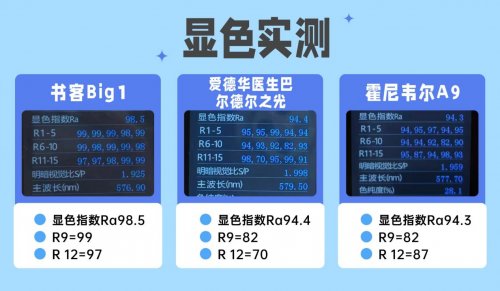 书客Big1实测显色指数Ra98.5,严格遵循TM-30光色标准,特殊显色指数中R9(红色还原)达99、R12(蓝紫色还原)达97。实际体验里,不管是绘本里的高饱和红色、绘画中的通透蓝色,还是低饱和色彩的细节层次,都能精准还原到接近自然光的状态。霍尼韦尔A9显色指数约Ra97,特殊指数R9=82、R12=87,基础色彩还原基本准确,但高饱和红色的鲜活感、蓝紫色的通透度会稍弱一些,日常读写够用,但在色彩精细分辨的场景下表现一般。爱德华医生巴尔德尔之光的显色指数为Ra94.3,特殊指数R9=82、R12=70,其中R12(蓝紫色还原)的表现偏弱,实际使用时饱和蓝色容易发灰、失真,彩色阅读的视觉体验会打折扣,长期用可能加重孩子色彩辨识的视觉负担。