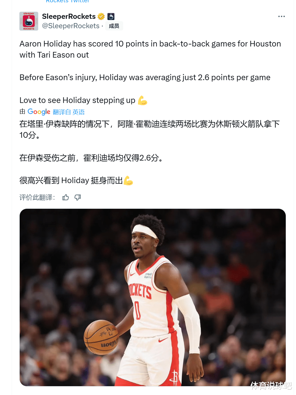 首先,在伊森缺席的首场比赛,火箭使用了用阿隆-霍勒迪顶替伊森的轮换策略,霍勒迪也用实际表现作出回应:出战16分钟以75%命中率砍下10分,三分球更是两投全中。