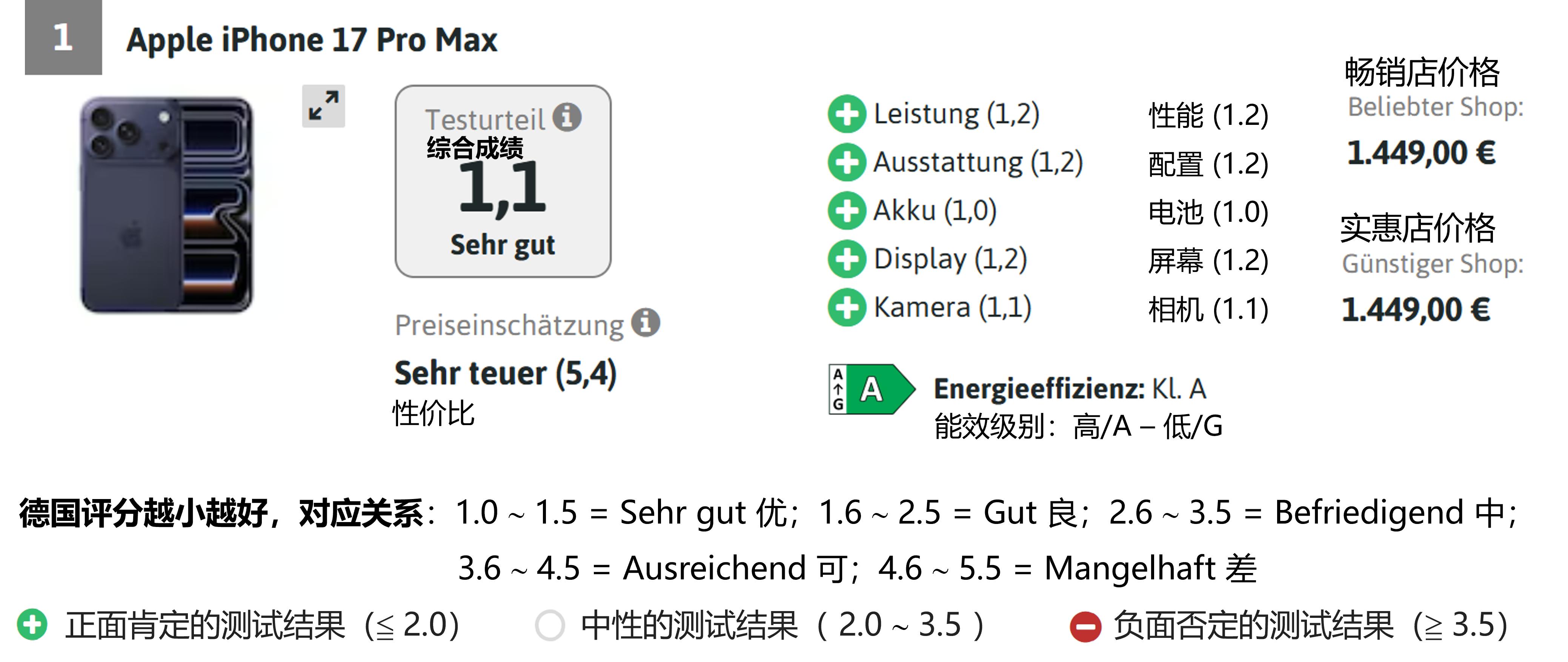 此外,可自由设置的动作按钮和相机控制功能也令人满意。苹果的人工智能功能虽然具有很高的数据保护性,但遗憾的是,其质量远不及安卓竞争对手。毫不奇怪,在测试时,iPhone 17 Pro Max 的售价约为 1449 欧元,并不是一款便宜的 iPhone。