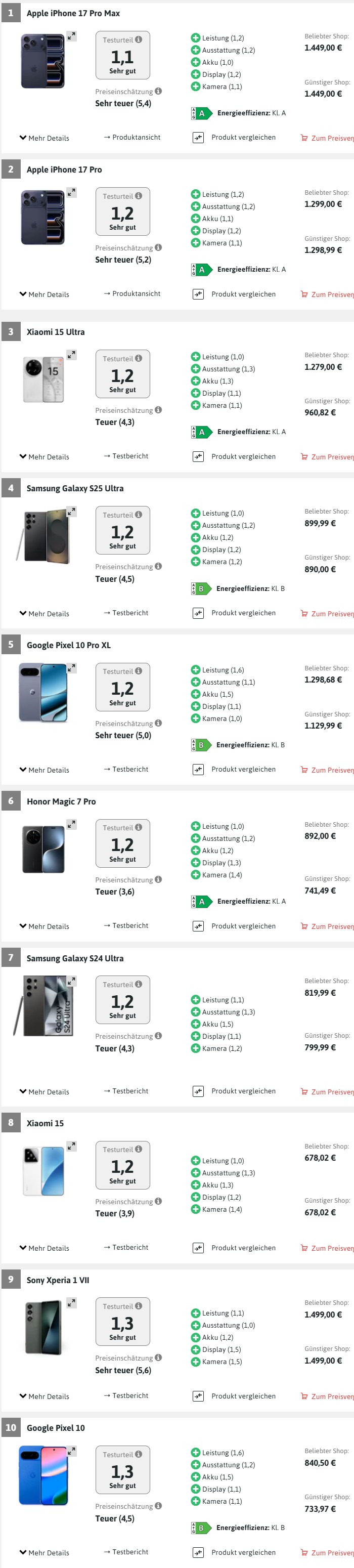iPhone 17 Pro Max 为苹果树立了新标杆,尤其是在电池续航方面:在我们的测试中,它持续运行了 27 小时。只需充电 30 分钟,即可获得 17 小时的续航时间。A19 Pro 处理器与新冷却系统相结合,提供了出色的性能,且不会明显加热铝制外壳。三颗 4800 万像素摄像头以出色的图像质量和精美的远摄变焦功能令人印象深刻。4K 视频和 1800 万像素自拍摄像头以及灵活的照片格式使这款手机的功能更加完善。6.9 英寸的 OLED 显示屏显示图像清晰锐利,色彩饱满,刷新率高达 120 赫兹。只有防眩功能还有待改进。但强大的防尘防水功能、快速的面部识别解锁、舒适的扬声器和最新的无线电标准都令人印象深刻。