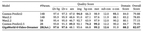 在 PBench(Robot Set)基准上,GigaWorld-0与当前先进的世界模型进行全面对比,为所有对比模型中参数量最小,整体性能最高的世界模型。这一结果证明GigaWorld-0在具身智能任务中兼具卓越的生成质量与极致的推理效率,是目前最具性价比的世界模型方案。