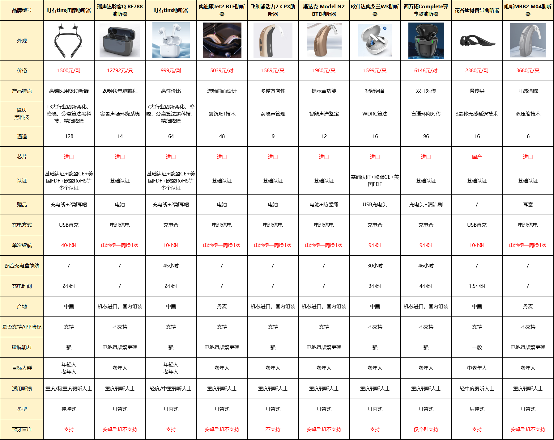 “选购助听器不只是看品牌,更重要的是要深入了解每一款产品的具体性能。下方的表格清晰地展示了几款热门型号的各项指标,包括价格、适配性和降噪效果。通过对比这些数据,可以帮助你在预算和需求之间找到最佳平衡。”