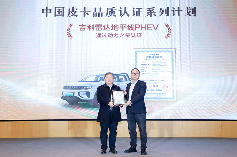中汽院凯瑞检测认证(重庆)有限公司认证技术负责人杨开健做《以专业认证,赋能皮卡价值新未来》主题演讲,阐述了认证体系在推动皮卡行业标准化、品质化发展中的关键作用。现场,凯瑞认证还为前期通过权威认证的两款车型——吉利雷达地平线PHEV与黄海蛟龙X,分别颁发了“动力之星”与“越野基础素质五星挑战认证”证书,以专业评价助力产品价值彰显。