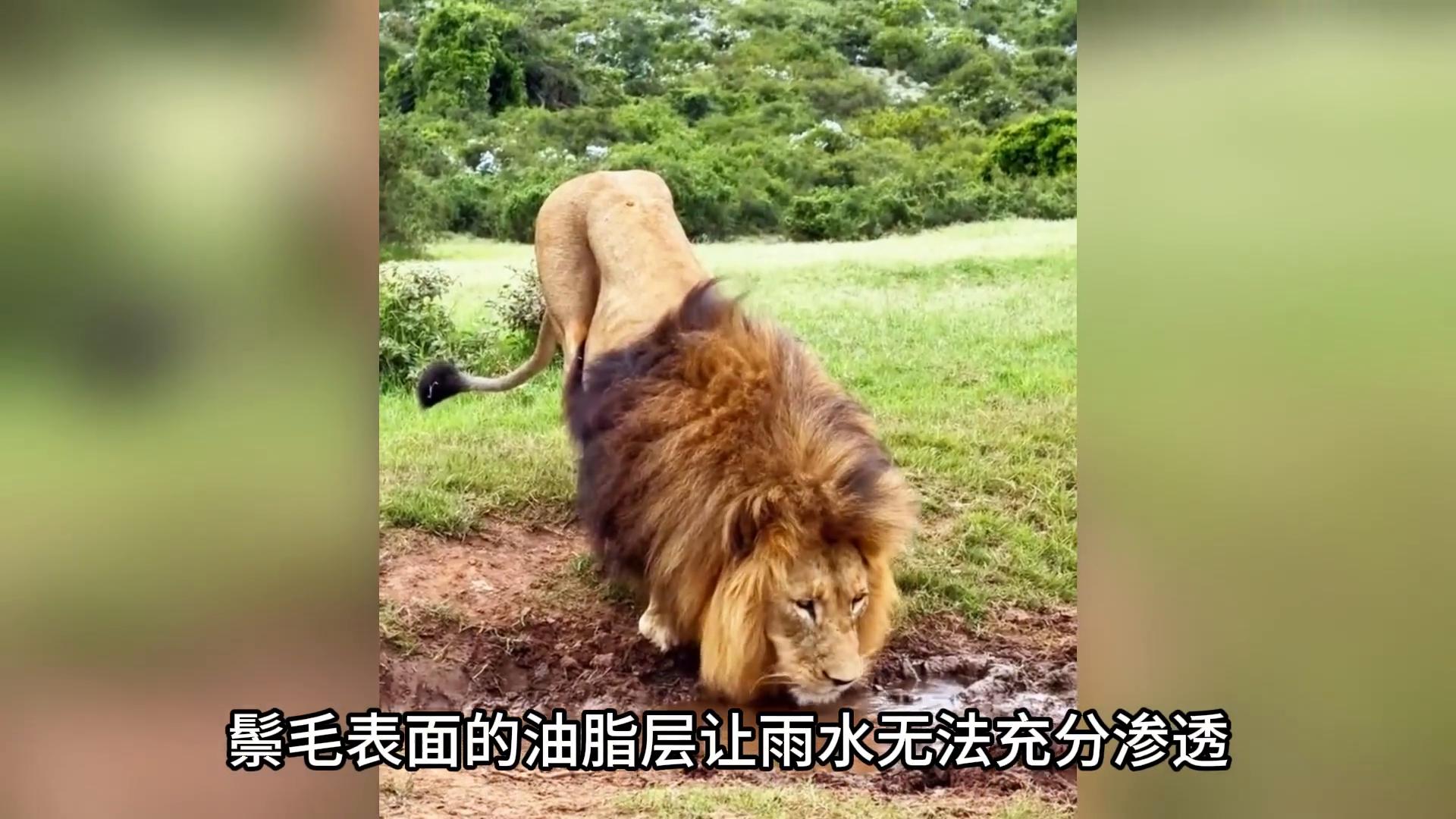 狮子的鬃毛是由粗、硬、坚韧的针毛组成,每一根都像细钢丝一样自带直立支撑力。鬃毛表面的油脂层让雨水无法充分渗透,不会因吸水增重而被压塌。且狮子的鬃毛异常浓密,层层交错形成立体结构,淋雨反而会让毛束更紧凑,看上去更显"板正"。