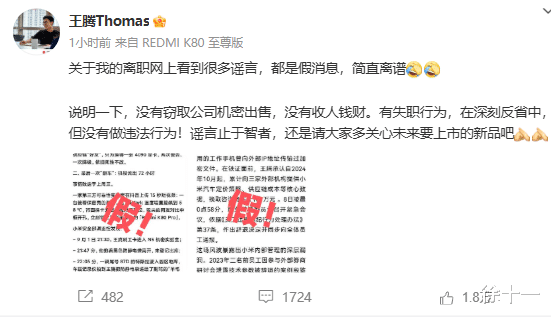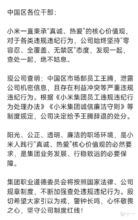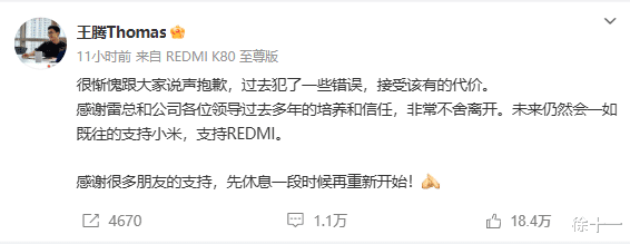 我开始刷到这个消息我还以为是同名,搜了搜才发现是真的是小米的王腾。但还以为是谣言,结果王腾亲自进行了回应:表示自己过去犯了一些错,接受该有的代价,后续回进行反省。