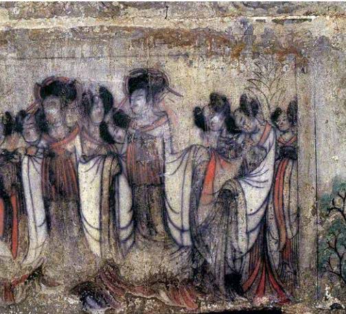 这种风俗到了北朝时期有了一定转变。随着北方少数民族的跃马南下,来自草原的风俗对中原传统的穿衣制度带来了冲击。北魏孝武帝曾“或时袒露,与近臣戏狎”。山西大同北魏司马金龙墓出土的袒胸女佣也可以作为这一时期衣着开放的佐证。北齐时期,这一风气仍然存在。河南安阳北齐范粹墓出土的女俑“头梳双髻,袒胸,着长裙”。崔芬墓的壁画描绘了墓主人夫妇出行的场面,画中女子襦衫领口开大,颈部与肩部裸露在外。这些袒露细节正是大唐袒胸装的起源。