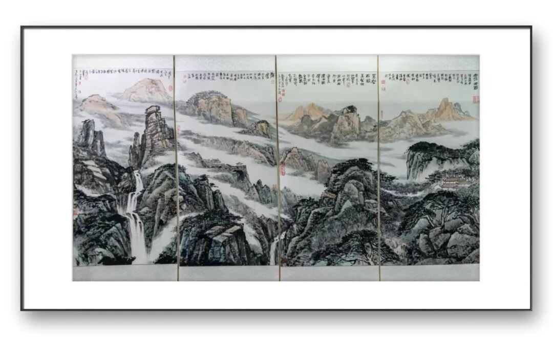 他善于运用留白的艺术手法,在画面中留下恰到好处的空白,虚实相生间,给观者留下无限的想象空间。远山朦胧、近石嶙峋,流水潺潺、飞鸟翩跹,留白之处,或为云雾、或为江水、或为天空,让画面更显空灵悠远,尽显东方美学的含蓄之美。同时,他注重画面的构图之美,遵循“疏密有致、欹正相生”的美学原则,山水、林木、亭榭、人物错落布局,既丰富了画面层次,又彰显了整体的和谐统一。他的作品,无论是巨幅长卷,还是斗方小品,都构图严谨、章法有序,大处见气势,小处见细节,让每一幅作品都经得起细细品味。