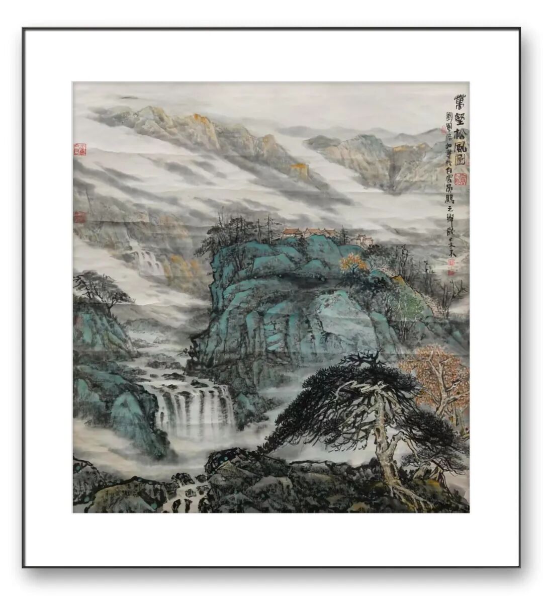 在墨法运用上,刘军老师更是匠心独运,将墨色的浓淡枯润、虚实相生发挥到极致。他主张“墨分五色”,以焦、浓、重、淡、清的墨色变化,营造出丰富的画面层次与悠远的意境。绘山石时,浓墨点染尽显厚重,淡墨晕染凸显空灵;绘云水时,枯墨挥洒彰显灵动,湿墨晕染传递温润,墨色的自然过渡与相互映衬,让画面既有雄浑壮阔的气势,又有清雅空灵的韵味。尤为难得的是,他善于将墨色与色彩有机融合,不刻意堆砌色彩,而是以墨为主、以彩为辅,浅绛色的淡雅、石青色的清丽、赭石色的厚重,与墨色相互映衬,既保留了传统山水画的雅致格调,又增添了画面的鲜活度与生命力,让山水之美在笔墨与色彩的交融中展现得淋漓尽致。