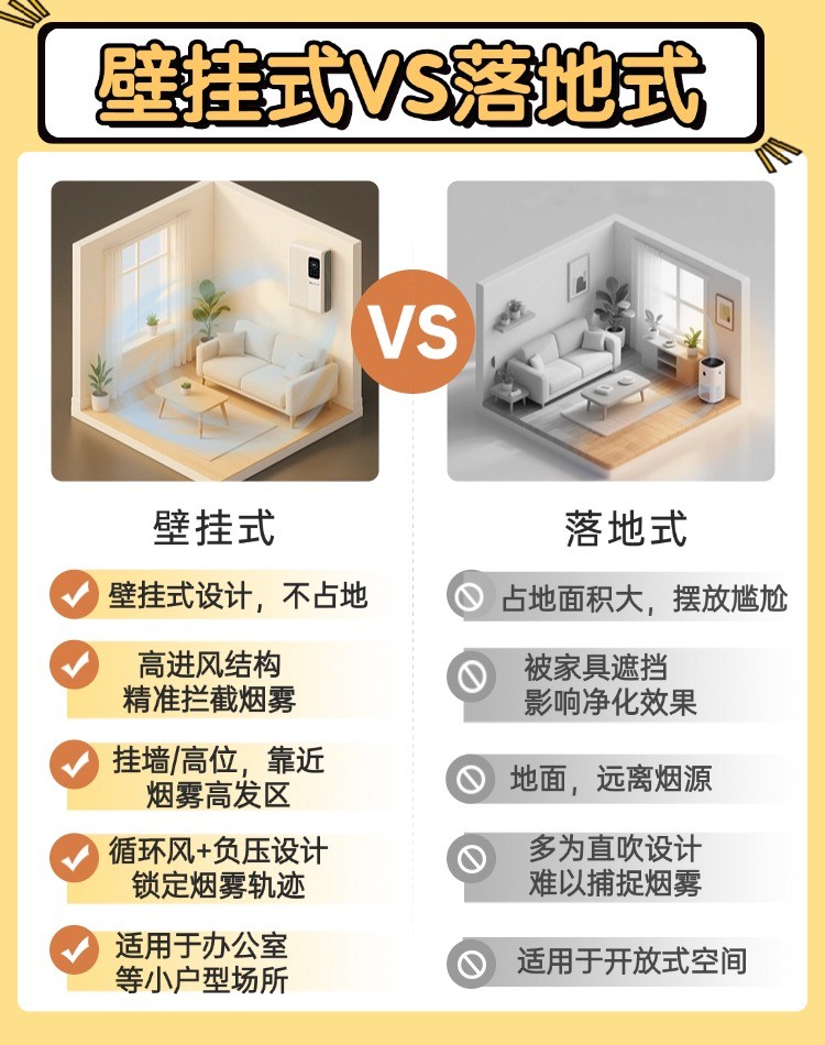 办公室空气净化器什么牌子好?二手烟先往上走,再扩散到房间,高位进风的壁挂式能在扩散前拦住大部分烟雾。这是结构优势,落地式很难弥补。