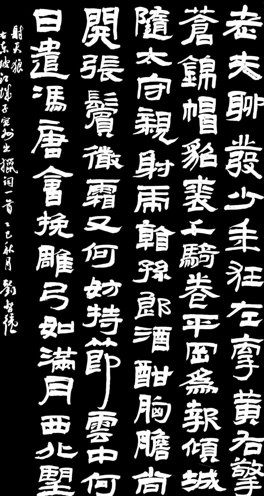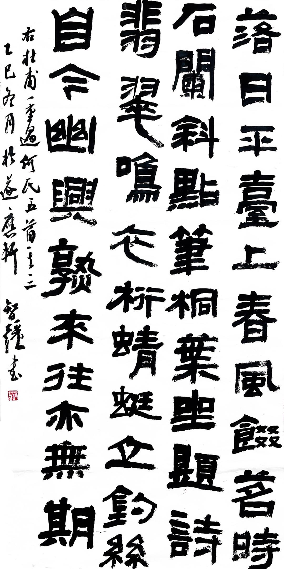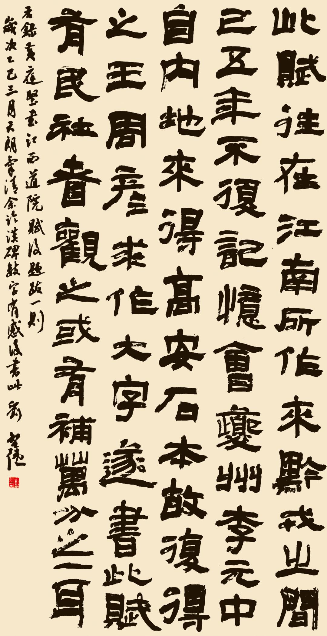 我此次全国第五届隶书展入展作品(如图),前后易稿数次,准备一月有余,截稿前两日在黄瓜园寝室写就定稿。自来南艺攻读博士以来,我在导师朱友舟教授的悉心指导下,于秦汉古隶书法上用功尤勤,对秦汉简牍、西汉刻石以及东汉碑做了系统梳理和研习。此次拙作在取法上无意展现“一家一体”的特点,欲取所学诸家之长,碑简互掺,尝试大胆取舍、融合;正文章法上采用有行无列样式,且落款略加行草意味,以抒胸中之意趣。作品不甚成熟,有幸入展全国第五届隶书展,实乃评委之鼓励。书艺漫道,吾当毕生求之!