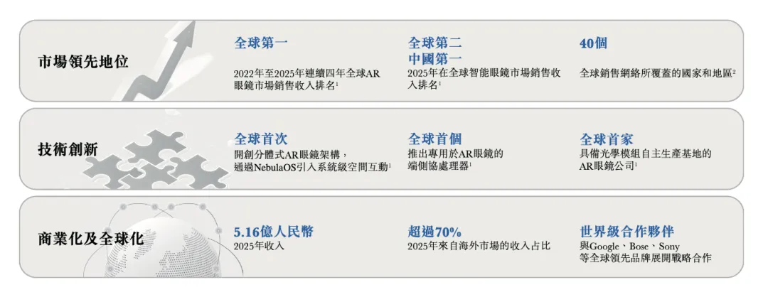 作为专注于AR眼镜,AI眼镜及空间计算技术的硬科技公司,XREAL凭借深厚的底层技术优势,已展现出极强的全球市场统治力。根据艾瑞咨询(iResearch)数据显示,按销售收入计,XREAL在2022年至2025年连续四年稳居全球AR眼镜市场第一;在更广义的智能眼镜市场中,XREAL于2025年位列全球第二、中国第一。