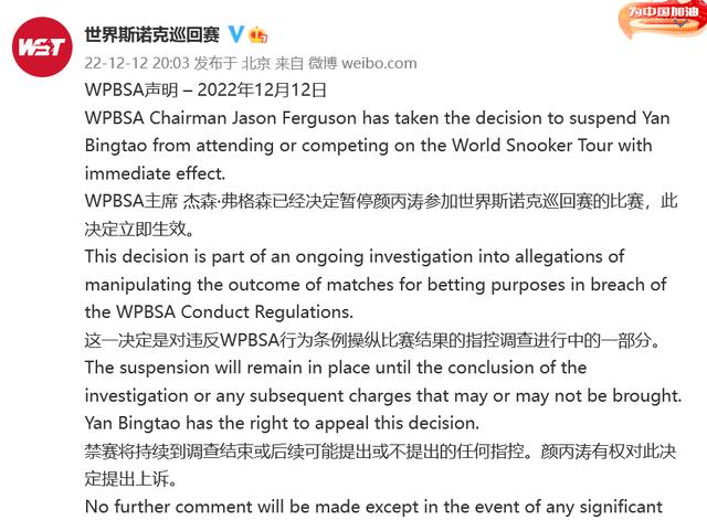 官方声明写道:WPBSA主席杰森·弗格森已经决定暂停颜丙涛参加世界斯诺克巡回赛的比赛,此决定立即生效。这一决定是对违反WPBSA行为条例操纵比赛结果的指控调查进行中的一部分。并且表示:禁赛将持续到调查结束或后续可能提出或不提出的任何指控。颜丙涛有权上诉!