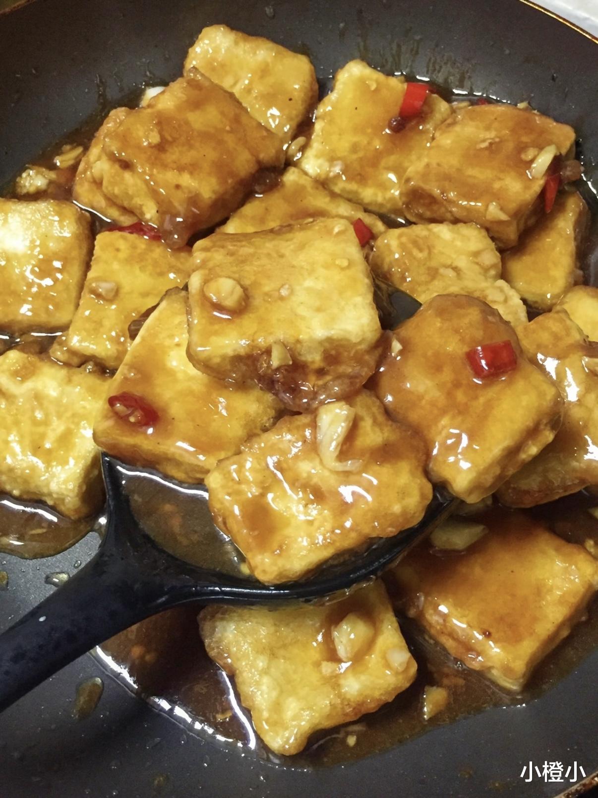 锅里留1勺底油,蒜末小米辣“滋啦”一声跳进去,辣椒的清香先跑出来,再倒入调好的料汁。火别开大,酱汁一冒泡就变稠,像咕嘟咕嘟的巧克力酱。赶紧把煎好的豆腐倒回去,用铲子轻轻推,别翻炒,会破相。让每片豆腐在酱汁里泡个澡,1分钟后汤汁收紧,亮晶晶地裹在表面,关火!