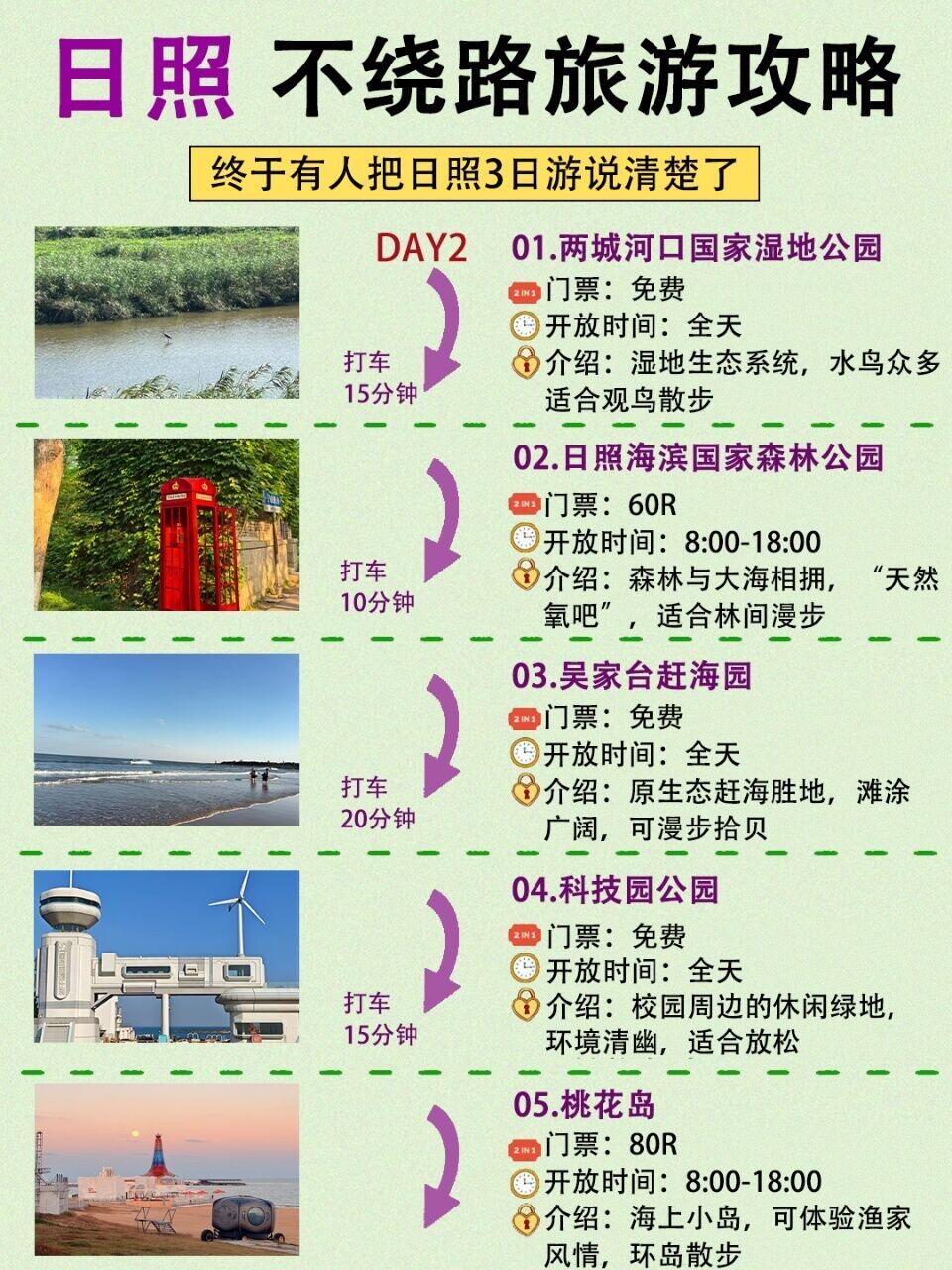 两城河口国家湿地公园→日照海滨国家森林公园→吴家台赶海园→科技园公园→桃花岛