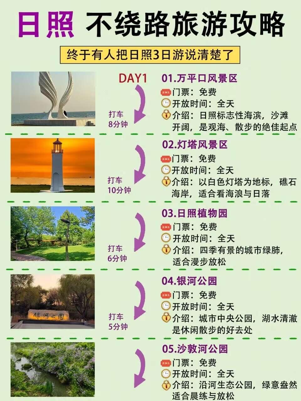 万平口风景区→灯塔风景区→日照植物园→银河公园→沙敦河公园
