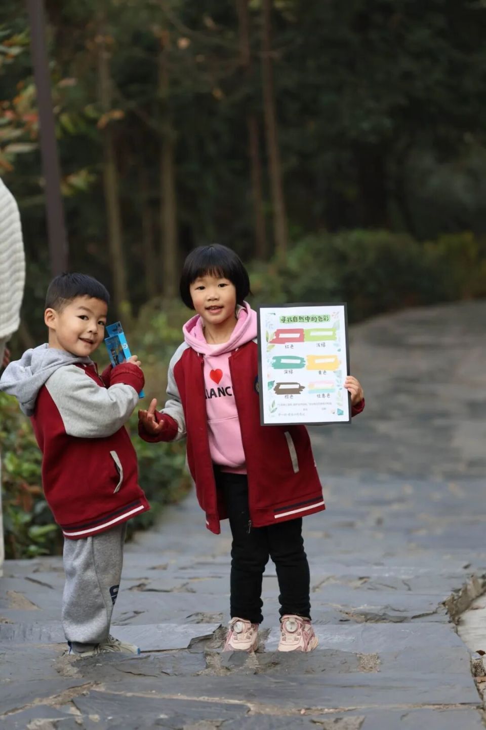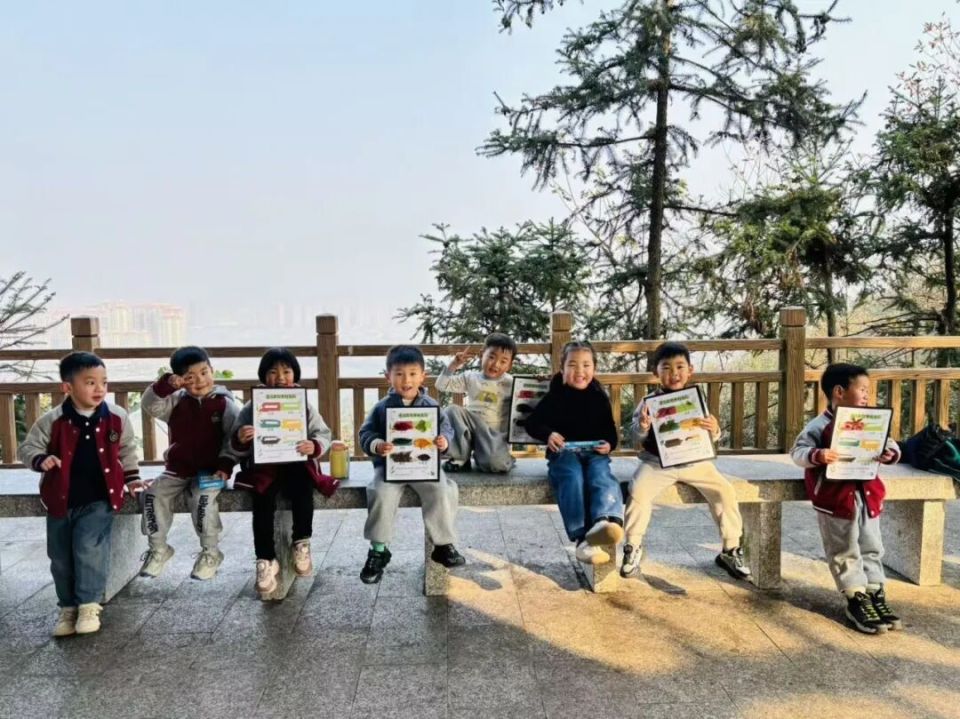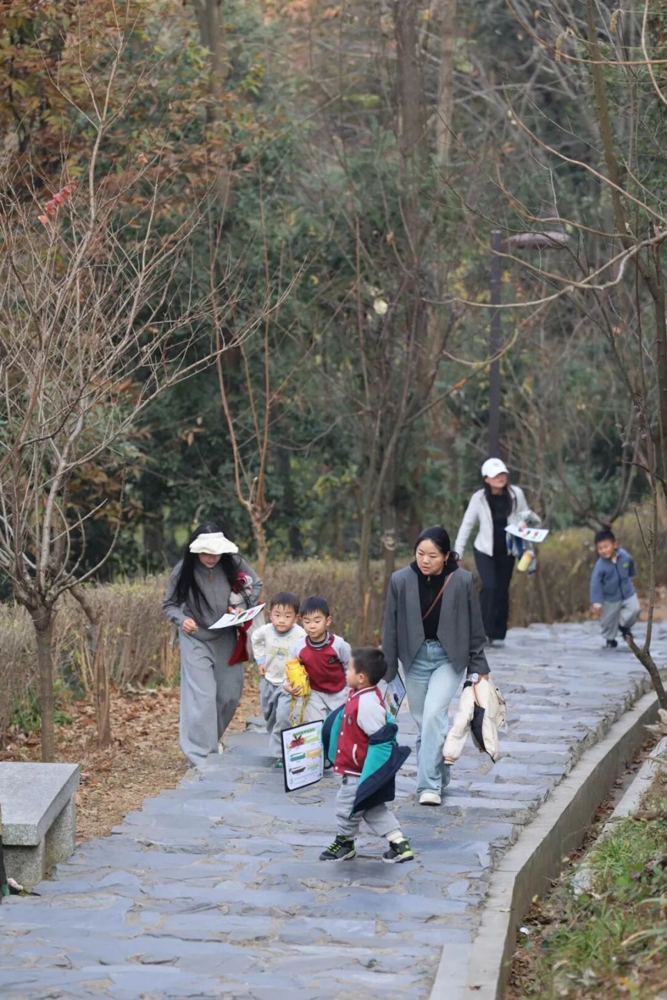 稍作休整,登山活动正式开启。老师提前规划了安全平缓的路线,关键节点的指引牌和工作人员,为亲子们的登山之路保驾护航。途中,宝贝们领取了“寻找自然的颜色”自然美育手工卡,和爸爸妈妈一起细心观察大自然,收集绿色的树叶、红色的花瓣、黄色的枯草……1 - 2个休息点让大家随时补充能量,班级老师沿途巡逻助力,提醒着大家爱护自然、不随意采摘。抵达山顶后,一张张合影定格了孩子们登顶的喜悦,也留住了与自然相拥的美好瞬间。