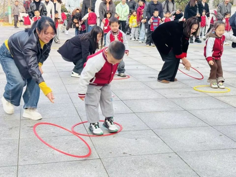 最令人期待的亲子游戏“袋鼠跳圈”火热上演!参与家庭被分成6队,每队6组家庭,接力圈、雪糕筒等道具将游戏场地布置得趣味十足。随着指令响起,家长抱着幼儿冲向终点雪糕筒,宝贝们双脚套圈、家长提圈跳跃,像一只只可爱的“袋鼠”接力前行。现场加油声、欢笑声此起彼伏,获胜家庭收获了美味小零食,所有参与家庭也都拿到了精致小玩具,这份小小的奖励,让孩子们的笑容更加灿烂。
