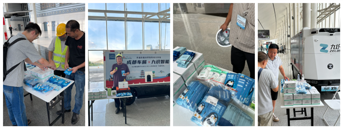 8月底的成都闷热异常,九识智能特别关注现场工人的健康与体验。搭载清凉贴/冰袋/湿巾/清凉油等防暑物资的Z5无人物流车,在作业间歇将一份份清凉与关怀直接送到工人们手中。“天气热,各位师傅辛苦了,快来贴一些清凉贴”九识工作人员与无人物流车一同,为他们加油鼓劲。这份暖心的科技范儿关怀,成为忙碌场馆内一道亮眼的风景线,也让参与车展筹备的工人,让高温下坚守岗位的工作人员感受到了别样的温暖,也展现出科技背后浓厚的人文精神。
