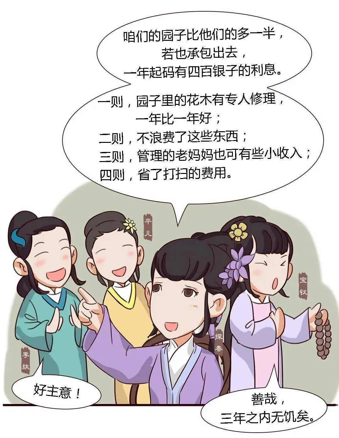 “四则亦可以省了些花儿匠、山子匠并打扫人等的工费钱。将此有余,以补不足,未为不可。”一二三四有这么多的好处--四赢。