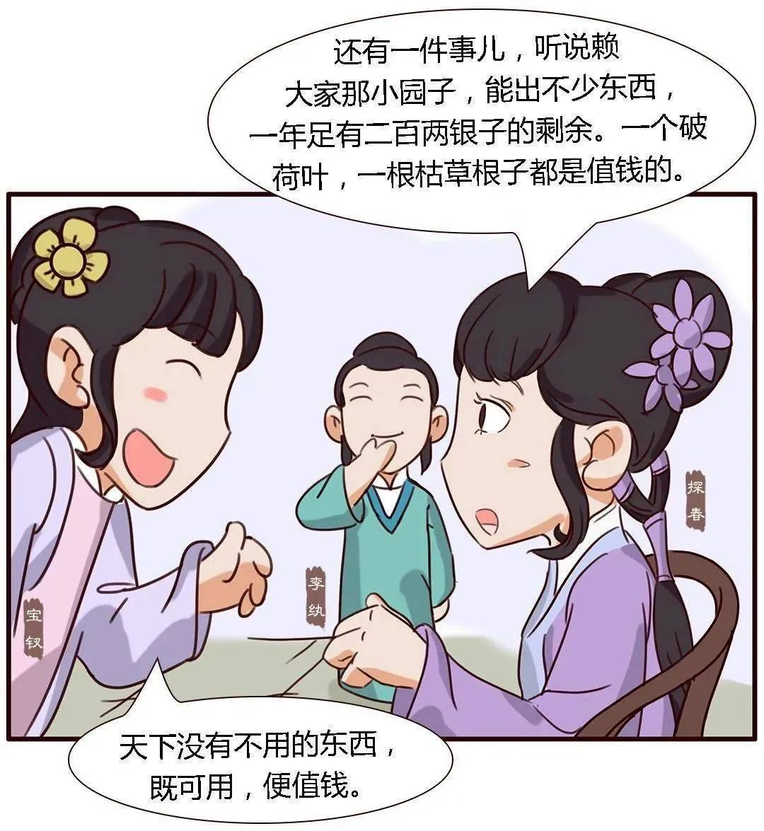 “宝钗道:‘天下没有不可用的东西;既可用,便值钱。’”这实际上是指产业经济,这几个女孩子真了不得,看起来不怎么管事,对很多问题的认识却很有见地。