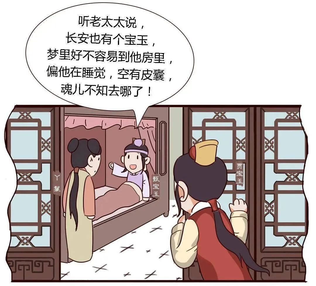 “贾母笑道:‘岂敢,就是我的孙子。人来!’众媳妇、丫环答应了一声,走进来。贾母笑道:‘园子里把宝玉叫了来,给这管家娘子瞧瞧,比他们的宝玉如何?’众媳妇听了,忙去了,半刻围了宝玉进来。四人一见,忙起身笑道:‘唬了我们一跳。若是我们不进府来,倘若别处遇见,还只当我们的宝玉后赶着也进了京了。’”作者有意在说两个人如出一辙,连身边的人都分不出来,南方的宝玉忽然来到了北方。