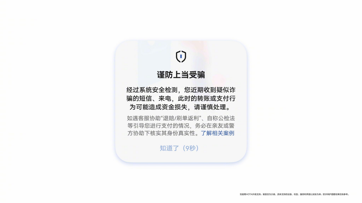 时值双十一购物高峰期,电信诈骗、应用骚扰等风险频发,让用户防不胜防。nova Flip S搭载的HarmonyOS 6,以“主动识别 +亲情联动”的双重防护,构建起全方位的安全守护网,成为用户与家人的“安全管家”。其中,AI防诈功能凭借先进的AI技术,可以根据通话信息智能识别刷单返利、假冒机票退改、虚假公检法等7类典型电信诈骗套路。当用户接听陌生来电时,系统能够即刻弹出预警窗口,并同步官方反诈提示,帮助用户在信息茧房中快速识破陷阱。这对于经常面对网购、兼职等高频风险场景的年轻群体来说,无疑是极为实用的“智能盾牌”。