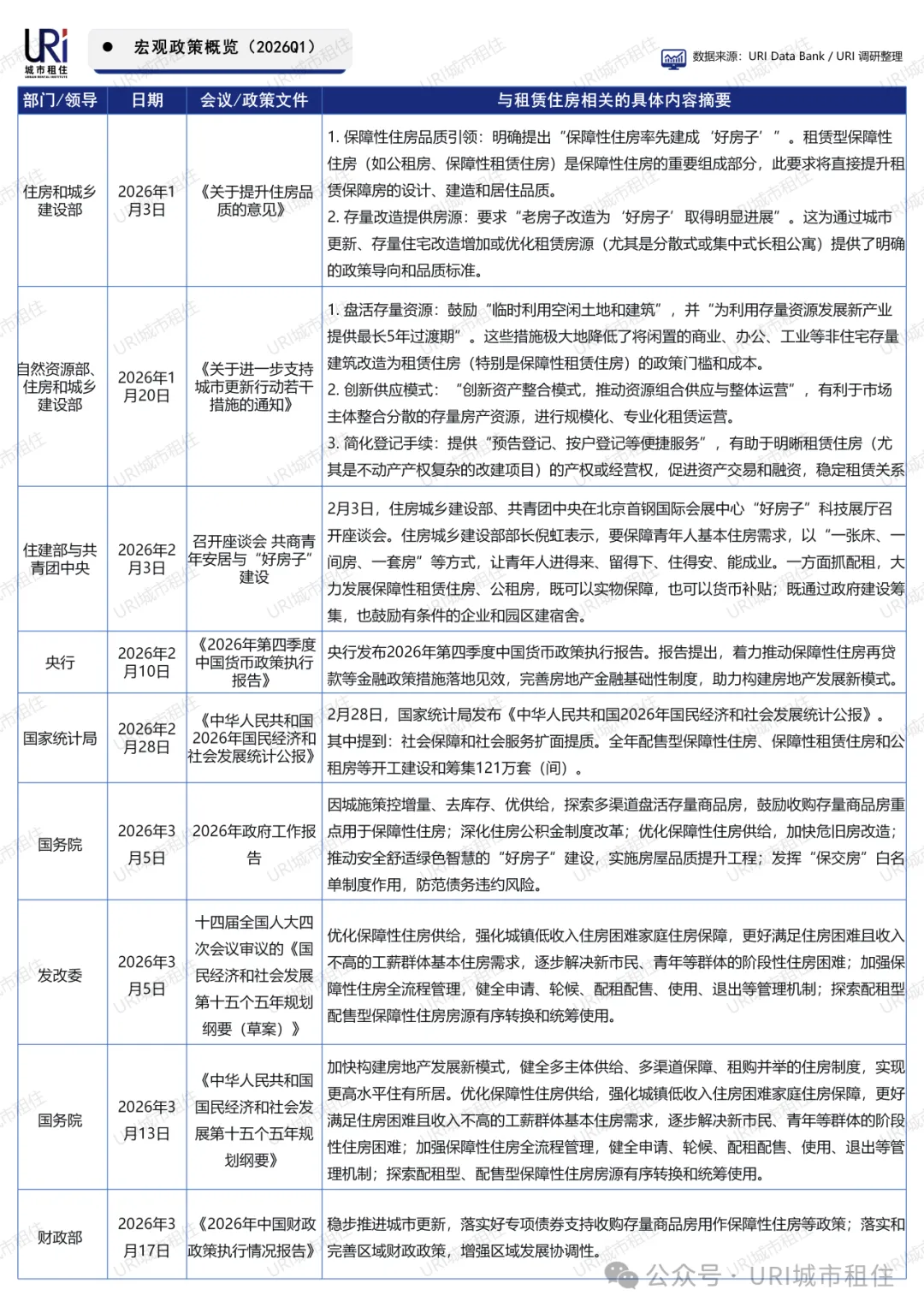 2026年一季度,国家多部门密集出台租赁住房相关政策。住建部与自然资源部聚焦“好房子”建设和城市更新,推动存量改造与品质提升;央行、财政部强化金融与财政支持,推动保障房再贷款和专项债落地;政府工作报告和“十五五”规划纲要明确优化保障性住房供给,健全全流程管理机制,探索房源有序转换。