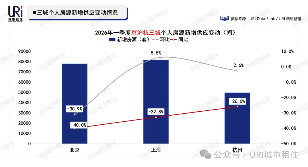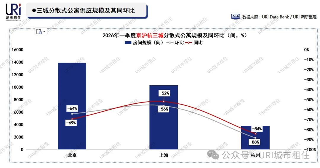 2026年一季度,三城分散式公寓新增房间规模全线暴跌,同环比降幅均在50%以上,杭州同比更是锐减84%,市场供应急剧萎缩。具体数量上,杭州仅新增3805间,北京新增1.39万间,仍为三城最高。
