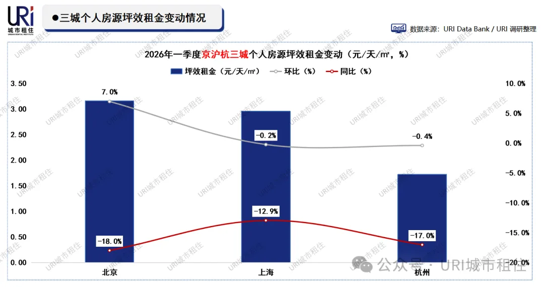2026年一季度,三城个人房源租金同比仍全面下降,北京、上海、杭州分别下跌18.0%、12.9%、17.0%,市场持续承压。环比方面,北京租金上涨7.0%至3.16元/天/㎡,表现显著回暖;上海、杭州则微降0.2%和0.4%,基本持平。北京租金反弹或与供应收缩、需求阶段性释放有关,而沪杭仍处温和调整通道。