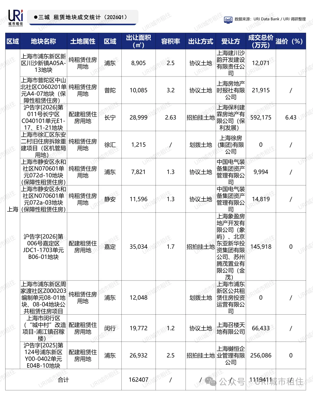 2026年第一季度,上海共成交10宗租赁住房用地,总出让面积约16.2万平方米,成交总价超111亿元,供应活跃。其中长宁区地块由保利发展以59.2亿元摘得(溢价6.43%),多宗纯租赁用地由国企协议或划拨取得,呈现“国企保基本、市场补高端”格局。同期,北京、杭州无租赁住房用地成交,市场热度集中于上海。