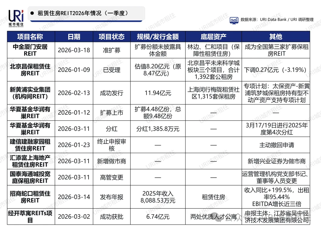 2026年一季度,保租房REITs市场活跃。中金厦门安居REIT获批扩募,成全国第三家;新黄浦成功发行11.94亿元机构间REIT;华夏华润有巢REIT完成扩募上市并分红;招商蛇口REIT年报显示收入增长近两倍,出租率超95%;北京昌保REIT获受理但估值微调;建信REIT主动终止;汇添富、城投宽庭分别新增做市商及高管变更;经开萃寓REIT获批6.74亿元。