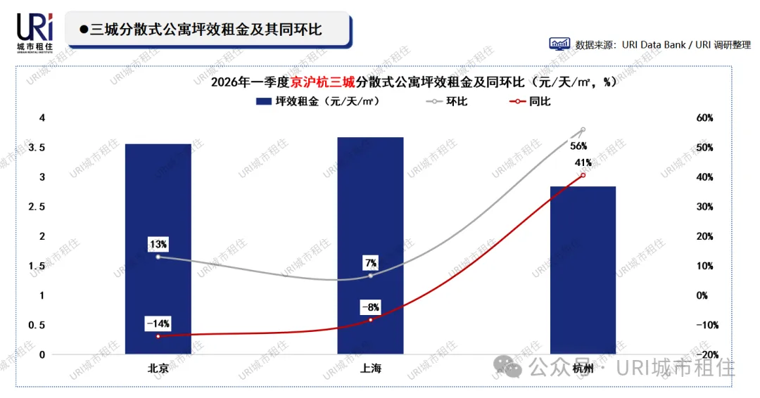 2026年一季度,三城分散式公寓租金环比均实现上涨,其中杭州涨幅高达56%,租金升至2.84元/天/㎡;北京、上海分别上涨13%和7%,租金达3.56元/天/㎡和3.67元/天/㎡。同比来看,北京、上海仍分别下跌14%和8%,而杭州同比大涨41%,呈现独立行情。杭州租金异动主要受供应断崖式收缩(同比-84%)影响,供需失衡推高价格。