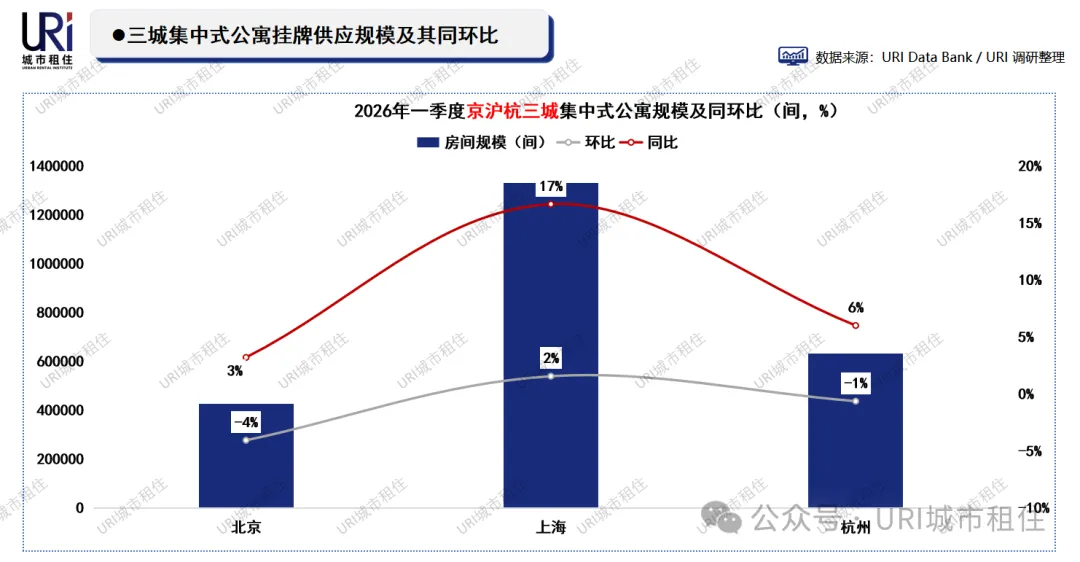 2026年一季度末,三城集中式公寓房间总规模约238.8万间,整体保持平稳增长。上海以133.2万间居首,环比增长2%、同比增长17%,增幅显著;北京规模42.5万间,环比微降4%、同比增长3%,基本持平;杭州63.3万间,环比下降1%、同比增长6%,稳中有升。