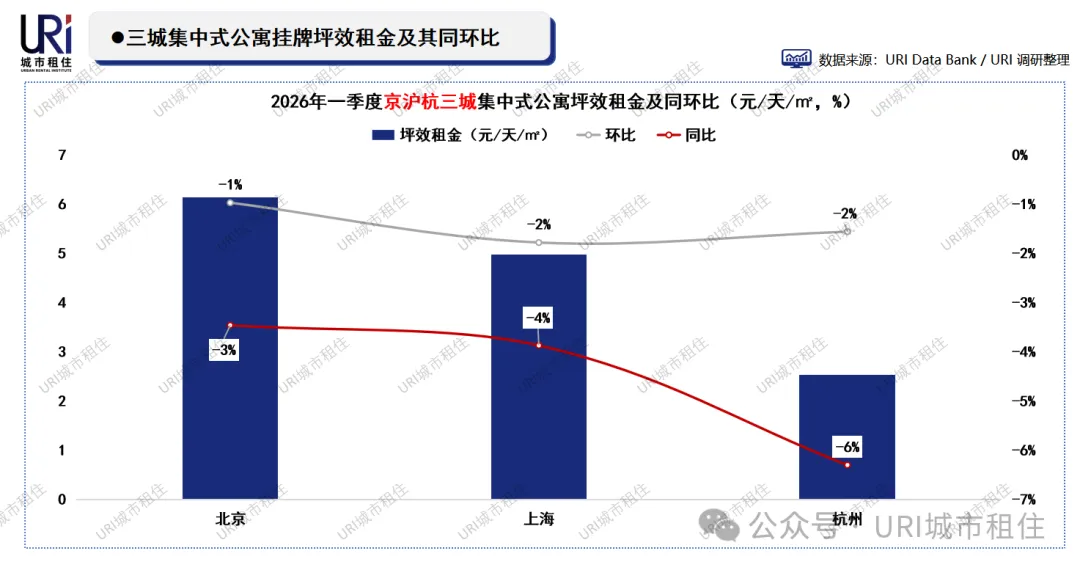 2026年一季度,北京、上海、杭州集中式公寓坪效租金同环比均温和走低。北京租金最高(6.14元/天/㎡),环比微降1%,同比下降3%;上海(4.97元)环比降2%,同比降4%;杭州(2.53元)环比降2%,同比降6%。